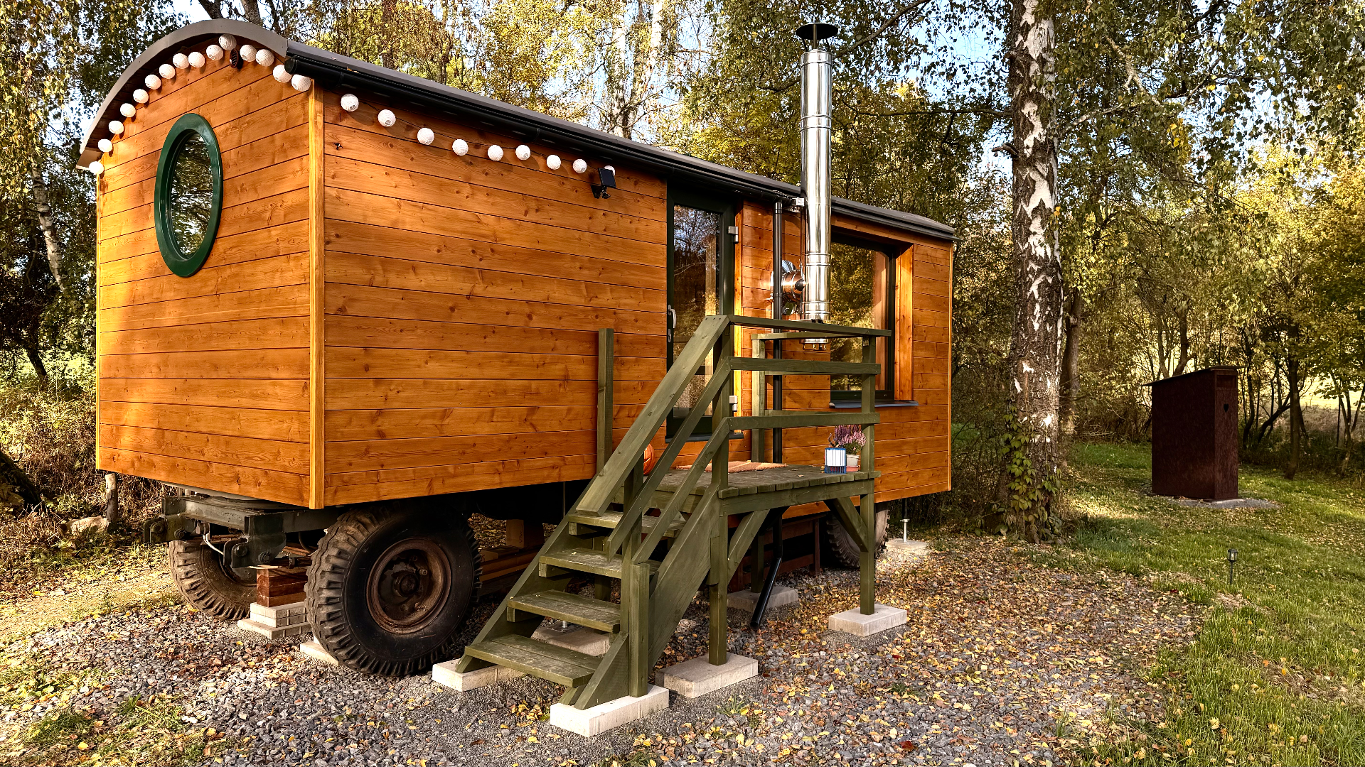Máme pro Vás nachystanou pohodlnou postel 160x200 a krásný výhled na západ slunce nebo na hvězdnou oblohu střešním oknem.