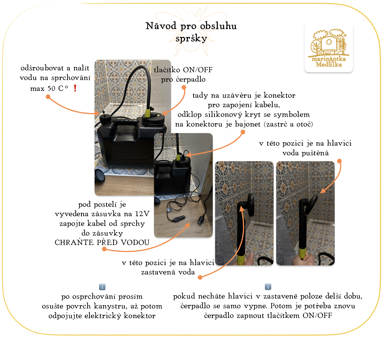 Veškerá voda je PITNÁ. Voda je pro vás připravena v kanystrech ve dřezové skříňce v kuchyni. Vodu si dolévejte do skleněné nádoby s kohoutkem. V dávkovači je připraven EKOLOGICKÝ prostředek na mytí nádobí a rukou.